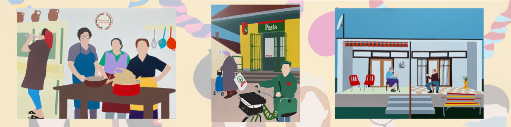 Festészetének központi témái a hétköznapi jelenetek, amelyek mindannyiunk kollektív emlékezetében ott élnek. Legyen szó a Balaton-felvidéki nyaralók teraszán átkiabáló szomszédokról (Szomszédok, 2025), vagy a „banyatankkal” közlekedő nyugdíjasról (Nyugdíj-expressz, 2026), a képek a magyar valóság mélyen emberi, olykor fanyar humorral átszőtt pillanatait rögzítik.